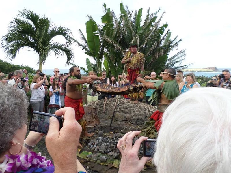 The oceanside setting set the stage for canoe rides and a re-creation of a traditional hukilau — pulling giant fishing nets from the sea. The constant activity allows you to choose which event to participate in, and you’ll need to choose because there isn’t time to do all of them before the imu ceremony signals that dinner is ready.