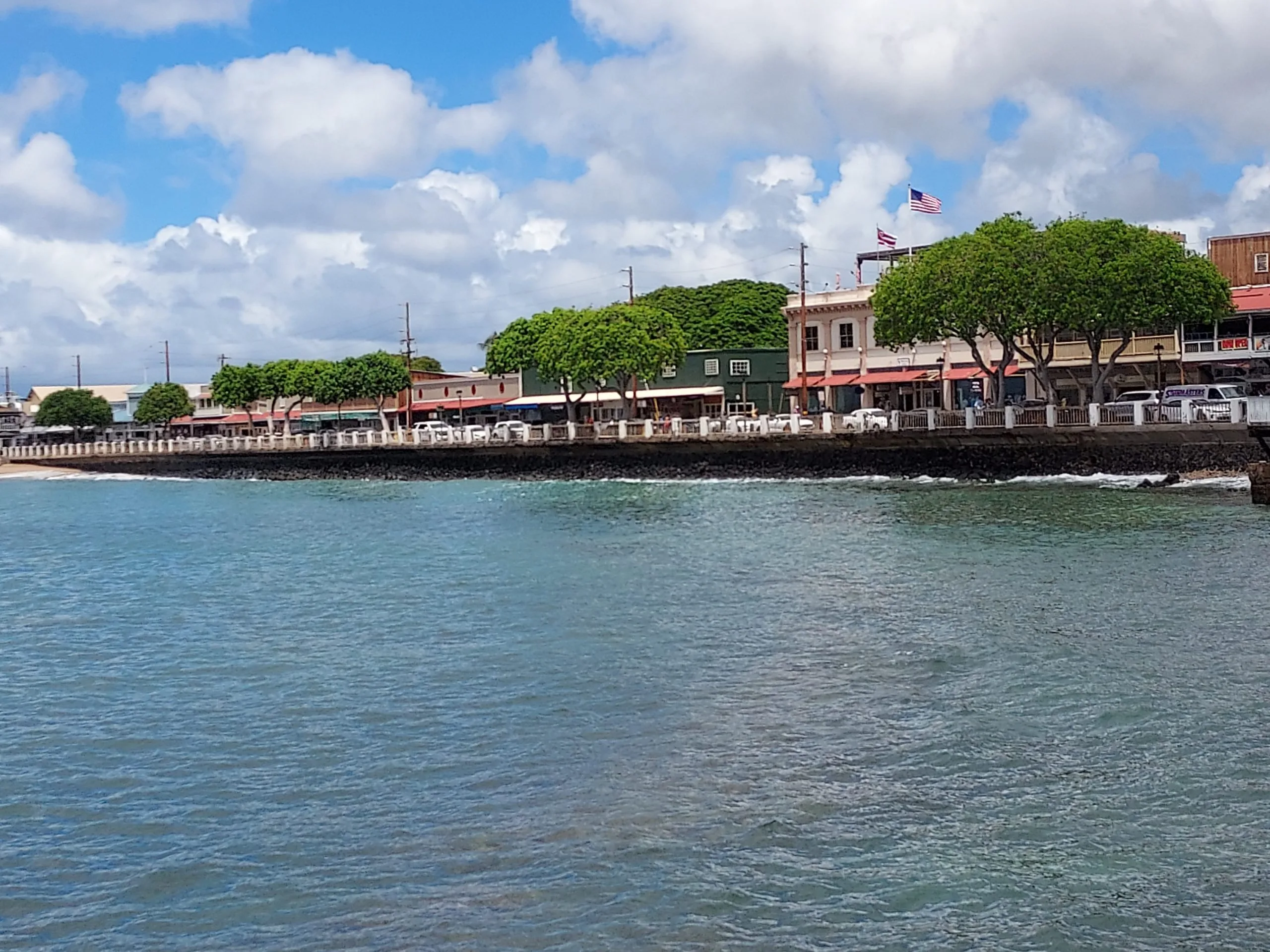 A colossal dive/tour boat backed into its birth as a twin-engine fishing boat chugged in after it. A small crowd waited for tables in a line outside Papa ‘Aina at The Pioneer Inn. Waves lapped along the seawall along the Lahaina Waterfront. Tourists and locals sat in the shade under Lahaina’s famous banyan tree.