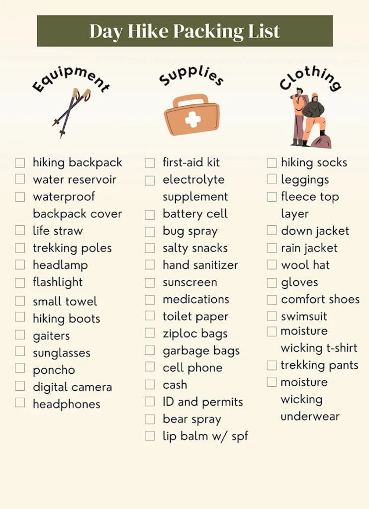 • Trekking poles: Assist with balance and stability.