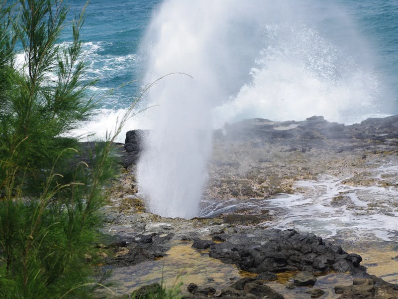 At the western end of the Poipu area is Spouting Horn. A lava tube channels water and air with each incoming swell, sounding a musical and guttural tone felt in the bones and shooting a powerful geyser into the breeze. It’s a rocky coast without a lifeguard. Best to watch and listen, as there is no sandy beach to lay out on or Ocean Safety personnel to look after you.