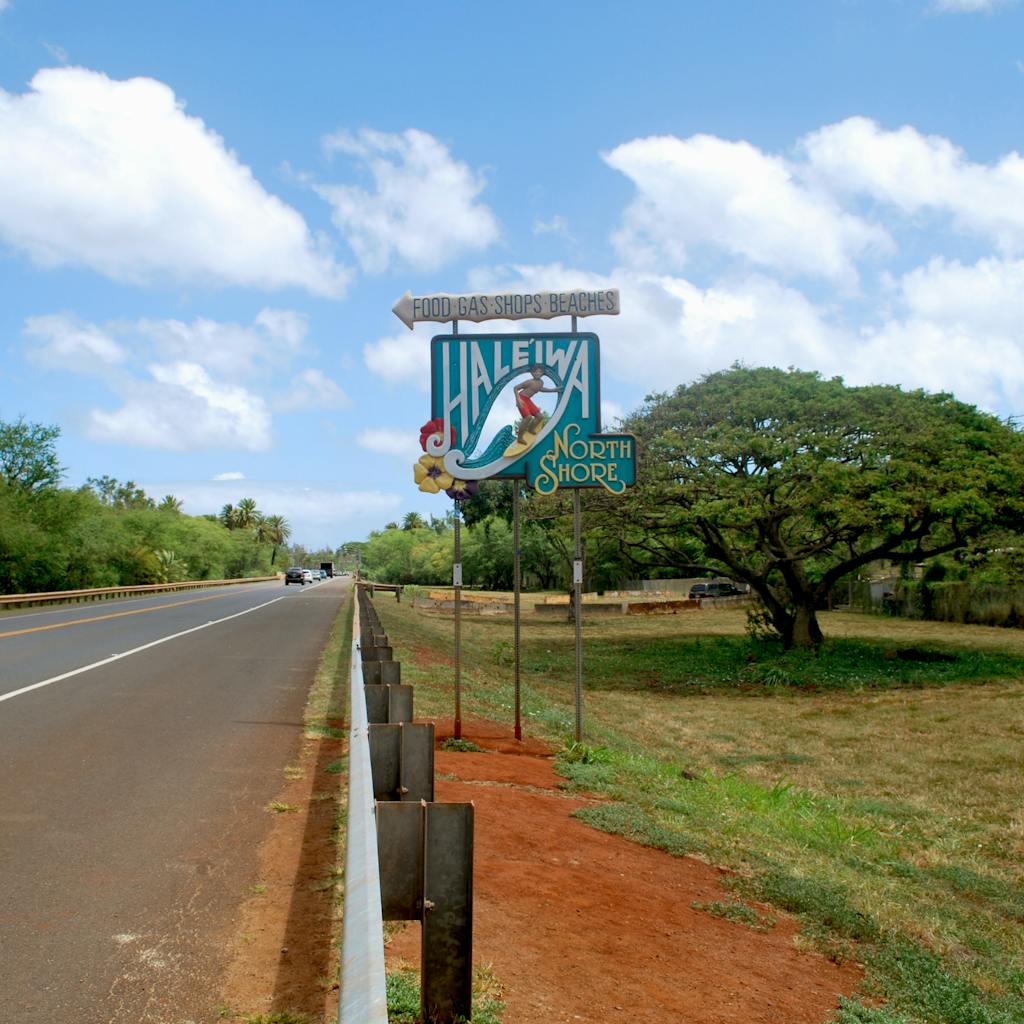 There are actually two signs — one at each entrance to the town. The wave that the surfer’s riding could be at any break, really, since the North Shore’s known for its massive winter surf. Haleiwa, however, has its own famous big-wave break called Alii Beach. During advisory-level swells, surfers will likely tow in with jet skis.
