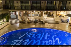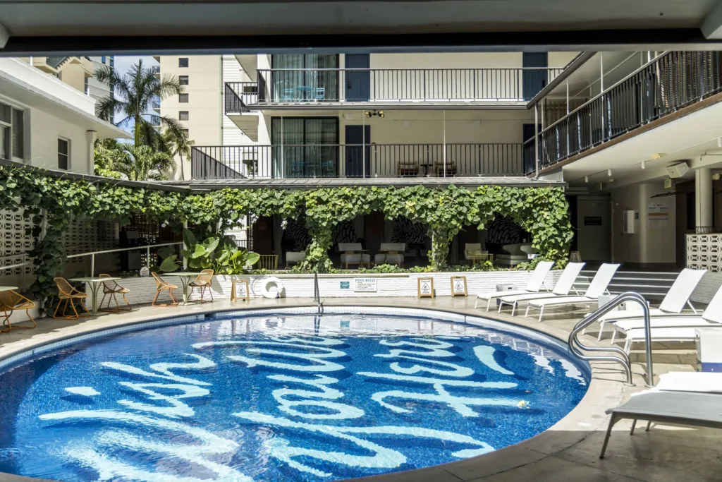 The Surfjack on Lewers Street is a boutique hotel in Waikiki. With a distinctly surfer-hipster-shabby chic feel, The Surfjack caters to a younger clientele eager for affordable but upscale and socially and environmentally conscious hospitality.
